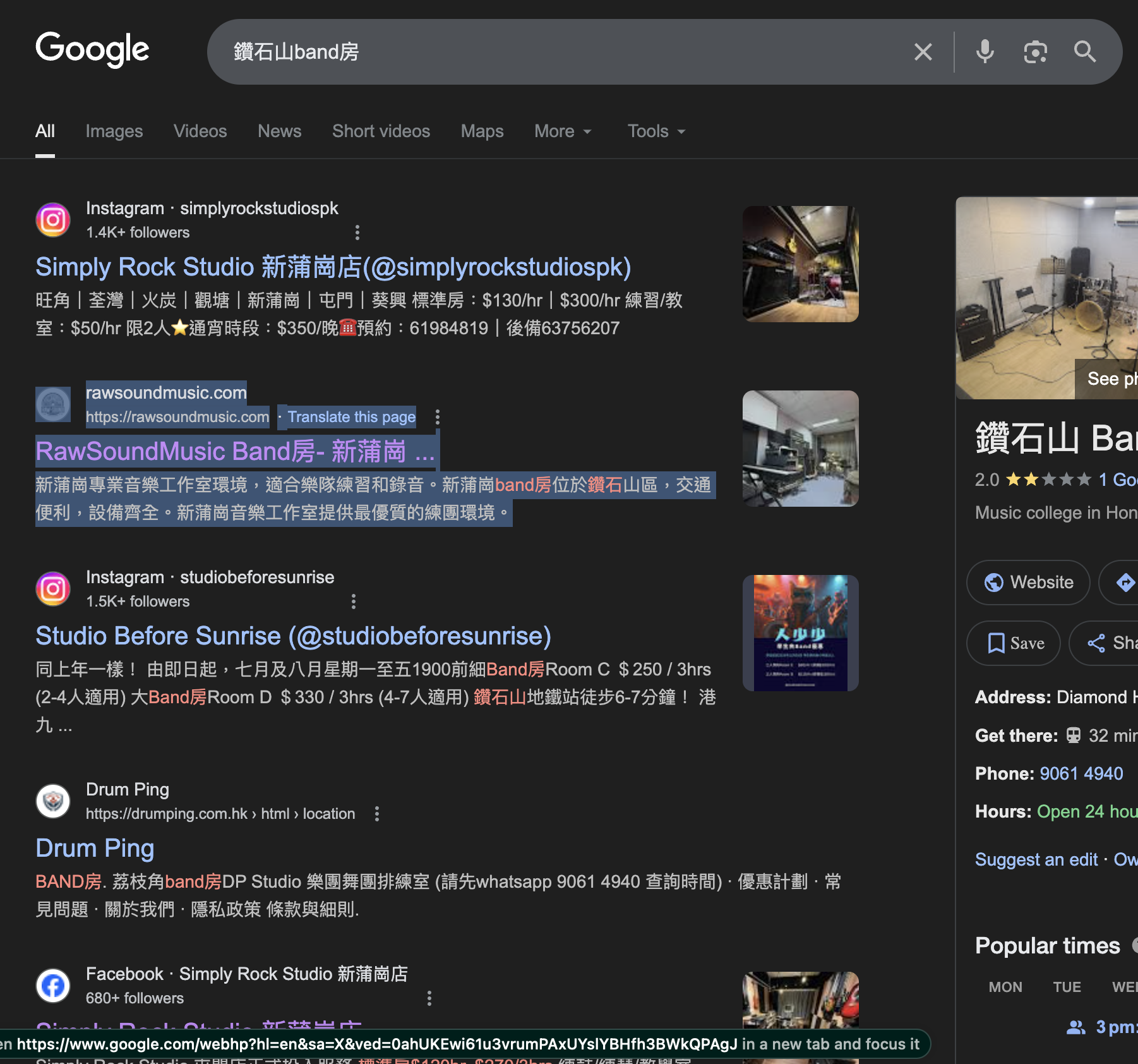 Raw Sound Music 是香港本地的樂隊室/錄音室。專案目標為 快速建立本地搜尋可見度 與 帶動預約轉換。考量到既有網站架構與時程,我們採用「以技術 SEO + 內容結構優化為主」的漸進式策略,不更換平台,確保風險最低、成效最快落地。